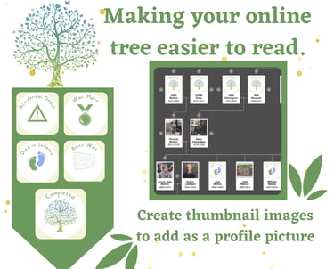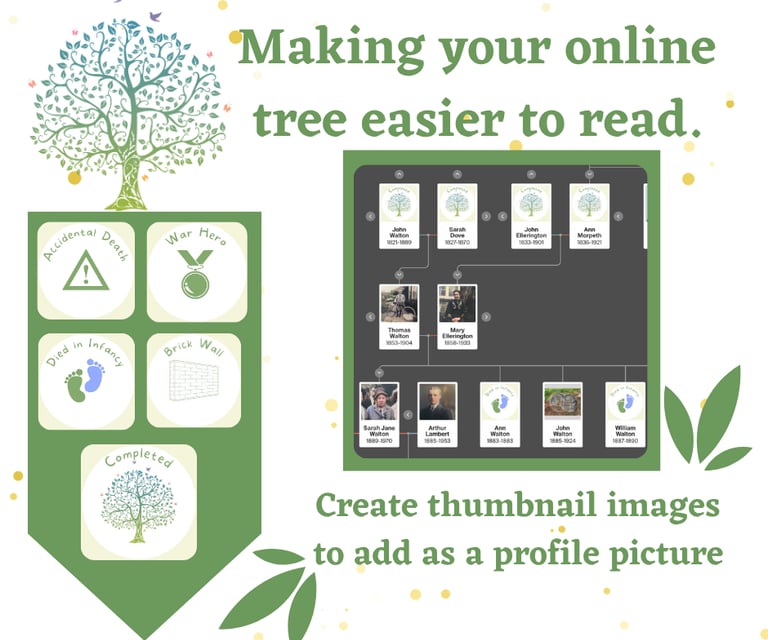 I do this by creating small thumbnail images to upload as profile pictures in my tree. These can be customised to suit whatever your needs are, I have used these only on my tree but it makes it so much easier to see quick facts on your tree.