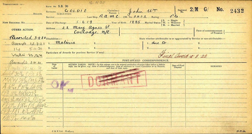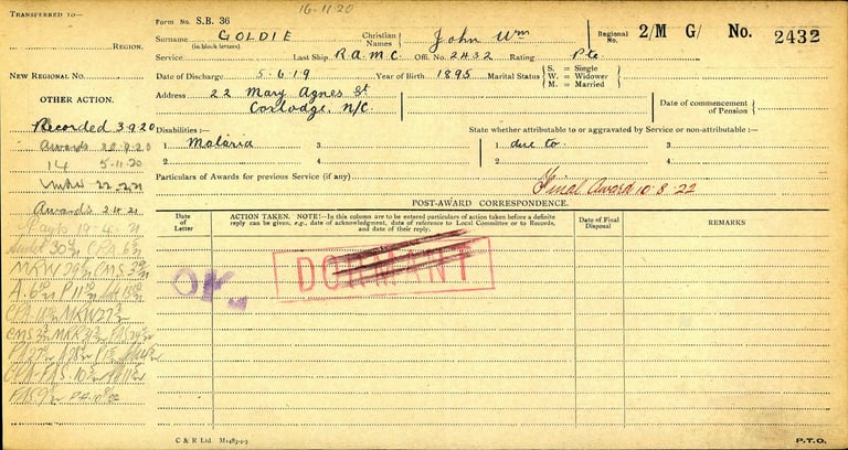 Not much documentation survives from John’s admission into the army, but whilst serving abroad he contracted malaria so we can deduce that he was stationed possibly in Africa in 1818 where malaria was rife.