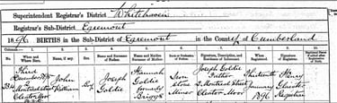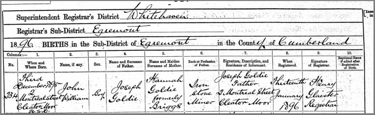 John was born on 3rd December at 2 Montreal Street, Cleator Moor north of Frizington. He was baptised 15th January 1896